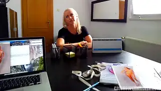 Опытная блондинка делает шефу минет, а мужик кончает на жопу