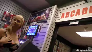 Порно видео В Сперме, Дрочит член - Телочка пришла в секс шоп и там зашла в комнатку, где можно подрочить на порнушку. Во время дрочки их стены появился член через дырочку. Баба решила подрочить и взять в рот черный хуй.