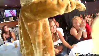 Перед толпой визжащих телок стриптизер публично ебет их подруг
