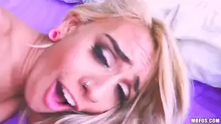Голубоглазая блондинка с отличной задницей классно прыгает писькой на члене
