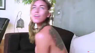 Старикашка трахнул попку и пизду высокой молодой блондиночки на диване
