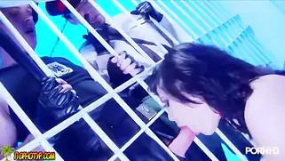 Копы трахают вдвоем похотливую преступницу в тюремной камере