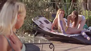 Порно видео Групповуха, Секс - Телочка читала эротический комикс и увидела, как на соседнем лежаке ласкаются русские лесбиянки. Она решили присоединиться и начался классный групповой секс трех баб.