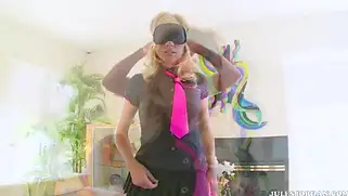 Блондинка с завязанными глазами сосет хуй негра и ебется