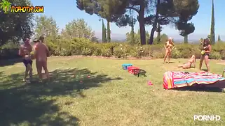 Группа парней и баб играет на воздухе, периодически трахаясь