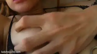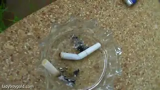 Транс сучка курит сигарету на свежем воздухе и дрочит член