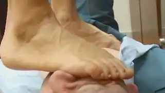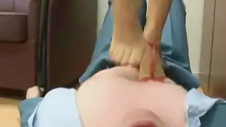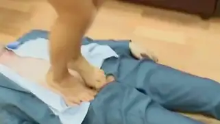 Порно видео Мастурбация, Русский секс - Стройная русская домина с красивым лицом и ногами топчется по лежащему на спине парню в своем офисе, красотка снимает обувь и прижимает хуй самца стопами