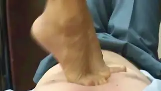 Русская домина в офисе топчется ногами по парню и его хую