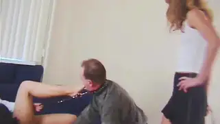 Две русские госпожи по очереди дают парню полизать ноги
