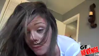 Порно видео В Сперме, Натуральные сиськи - Брюнетка в очках раздевается и показывает приличные натуральные сиськи, делает глубокий минет и трахается с мужиком, который кончает на жопные булки сучки