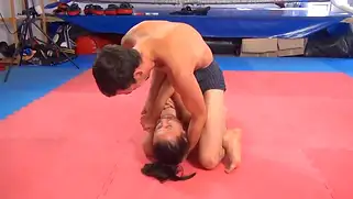 Порно видео Групповуха, Муж смотрит - Голая телочка борется с небритым мужиком в трусах и побеждает парня, проводя особенно ловкие захваты мужской шеи ногами, запасная спортсменка наблюдает за шоу