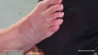 Домина с большими буферами предлагает парню поласкать пальцы ног