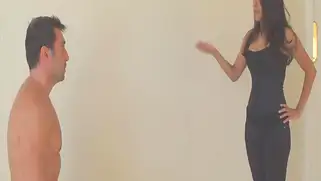 Порно видео БДСМ / BDSM, - Стройная госпожа с темными волосами проводит разминку с парнем в длинных шортах, классический боллбастинг доставляет удовольствие девушке и послушному парню