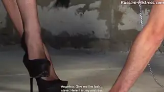 Стройная русская госпожа наказывает мужика по пяткам, спине и жопе
