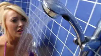 Блондника с силиконовыми сиськами дрочит киску в масле и под душем