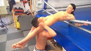 Красотка откинулась на канаты ринга и дает мужику лизать пизду