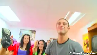 Студентки в ярких одеждах наблюдают как подружек ебут на хора