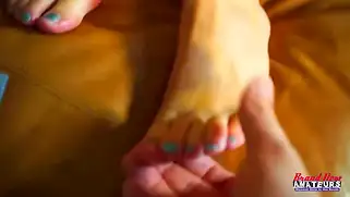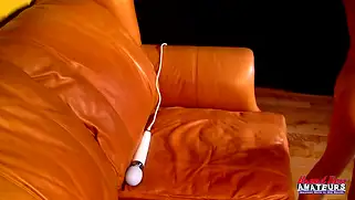 На мягком кожаном диване симпатичная сучка кончает с вибратором
