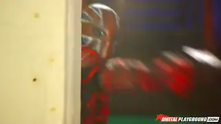Парень с бабой в костюме будут заниматься сексом, не снимая их