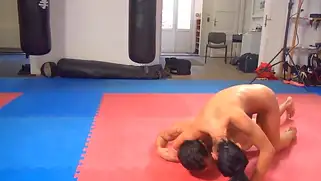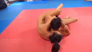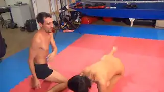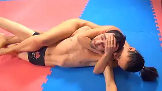 Худая брюнетка собрала волосы в пучок и села на лицо борца
