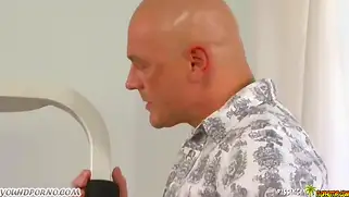 Лысый мужик трахет двух красоток и ссыт на них сверху в финале