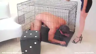 Порно видео БДСМ / BDSM, - Голый раб в ошейнике на поводке сидит в клетке и слушает смех двух доминирующих сучек, госпожи бухают вино из больших бокалов и прикалываются над пленником