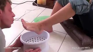 Чтобы угодить госпоже мужик гладит и лижет ноги красотки