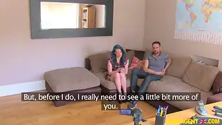 Зрелая баба с синими волосами будет сосать и трахаться на диване
