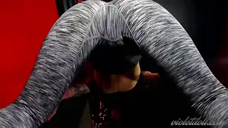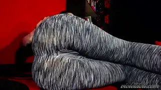 Красотка в серых леггинсах позирует и стягивает штанишки