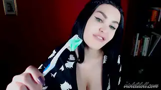 Сисястая баба перед веб камерой показывает буфера и зубную щетку