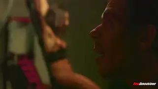 Голая шкура весит на веревках в воздухе, а мужик лижет ей киску