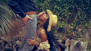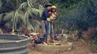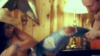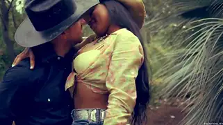 Ковбой будет трахать в киску черную телку и кончает ей в пизду