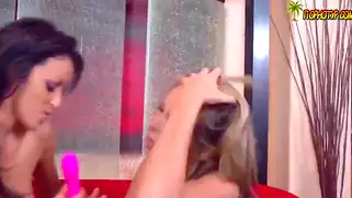Крашенная блодни в чулках трахается с брюнеткой при помощи дилдо