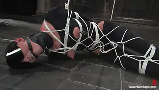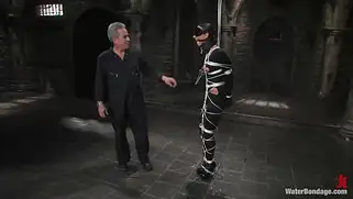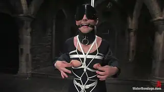 Мокрую грациозную брюнетку связали и стали трахать палкой с насадкой
