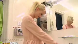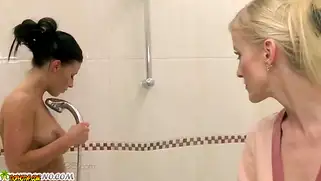Стройная блондинка и брюнетка занимаются сексом в душевой