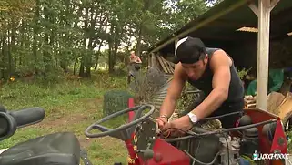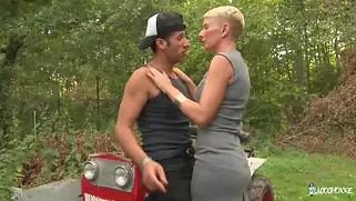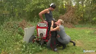 Порно видео Минет, Блондинка - Баба привела парня к трактору и они там начали заниматься сексом. Она сосала ему член в разных позах, а он потом трахает её влажную киску на свежем воздухе.