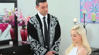 Мужик в халате поимел блондиночку и кончил ей в ротик спермы