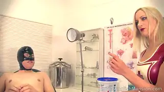 Белокурая госпожа трахает мужика в уретру разными штуками
