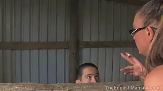 Грудастая госпожа держит в хлеву мужика на котором катается верхом