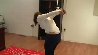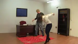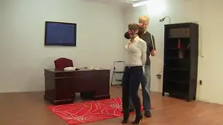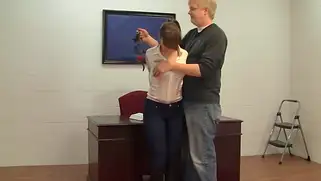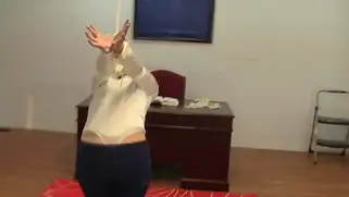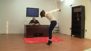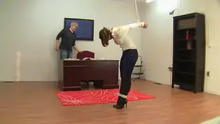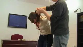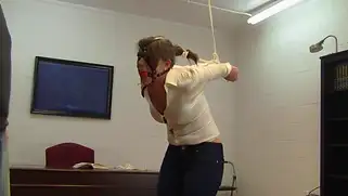 Порно видео БДСМ / BDSM, - Мужик на работе связывает свою сотрудницу в белой сорочке, начальник поднимает руки сучки высоко вверх и назад, а потом подвязывает за запястья к потолку