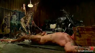 Порно видео Анал, В попку - Крепкий татуированный парень связан татуированной госпожой, красотка нагибает чувака вниз и начинает трахать попку самца, после чего подставляет киску