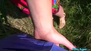 Девушку трахают за городом в ротик и она получает сперму на язык
