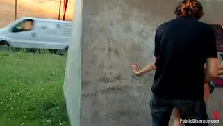 Чувак ебет связанную сучку на улице, а подружка ему помогает