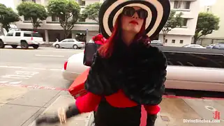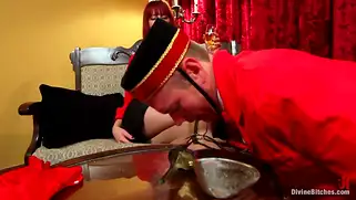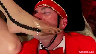 Швейцар лизал ноги рыжей госпожи, пока телочка кончала с вибратором