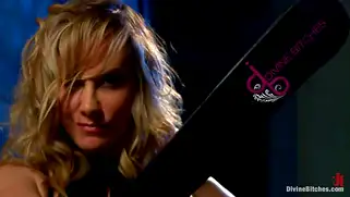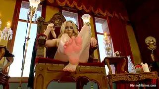 Порно видео Мастурбация, Самотык - Сочная блондинка фетишистка сидит на троне и выставляет вперед ножки, шевеля пальцами перед публикой, потом сучка направляет в пизду самотык и мастурбирует