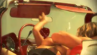 Волосатый чувак в кабриолете трахает и дает в рот блондинке