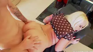 Голубоглазая блондинка с отличной задницей классно прыгает писькой на члене