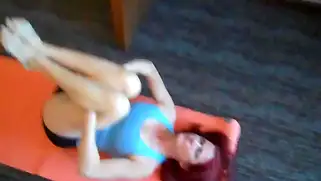 Пожилая рыжая блядь упражнялась на коврике и трахалась с ебарем