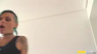 Полицейский трахает шлюшку в татуировках и кончает ей на лицо