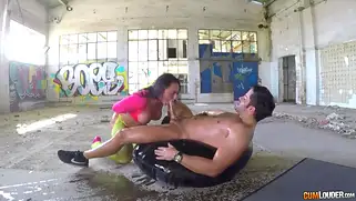 Накаченный парень трахает негритянку в заброшенном здании в рот